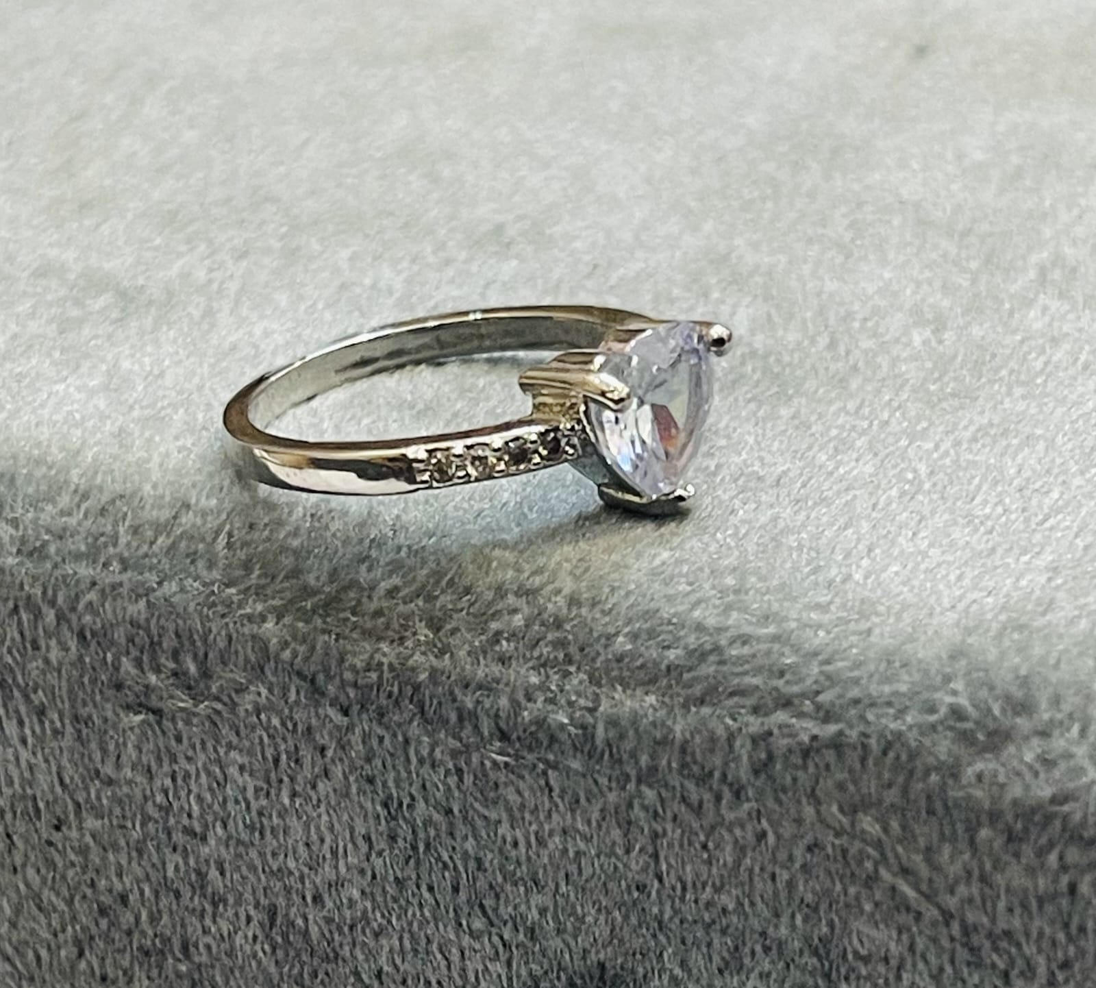 Romance in every detail 💖. This delicate silver-tone ring features a sparkling heart-cut crystal at its center, accented with tiny shimmering stones along the band ✨—a perfect gift or keepsake to cherish forever.